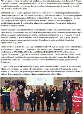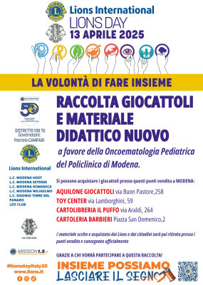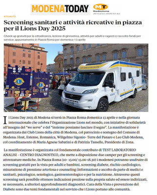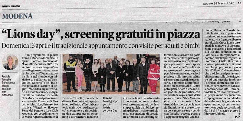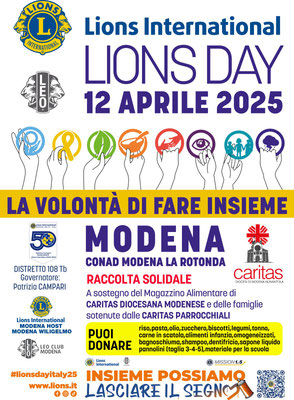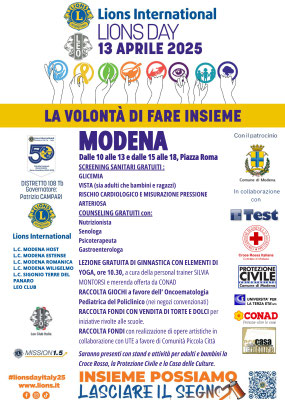 Il Lions Club Modena Host sarà protagonista del LIONS DAY 2025, insieme agli altri Lions Club della Città, che si terrà Domenica 13 aprile in Piazza Roma. Anche quest’anno saremo al servizio della cittadinanza, con screening sanitari gratuiti, raccolta giochi e materiale didattico e raccolta alimentare a supporto della Caritas modenese.